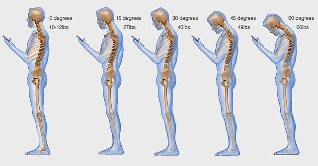 Sabíes que el cap pesa entre 5 i 7 kg? Doncs aquest pes es va incrementant a mida que mantenim el cap més flexionat, posicions que cada cop son més habituals amb l’ús dels dispositius mòbils. Mantenir el cap a 45 graus equival a que la columna cervical aguanti 22 kg de pes… i de mitja passem de 2 a 4 hores al dia llegint o escrivint amb telèfons o tauletes.